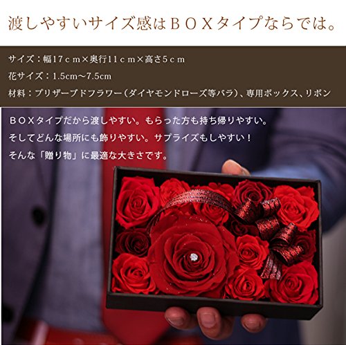 - サイズ 高さ約5cm×幅約17cm×奥行約11cm・花サイズ 1.5cm~7.5cm・材料 プリザーブドフラワー(ダイヤモンドローズ等バラ)、専用ボックス、リボン
