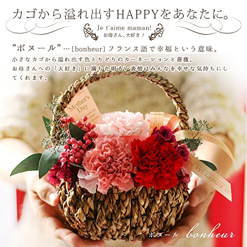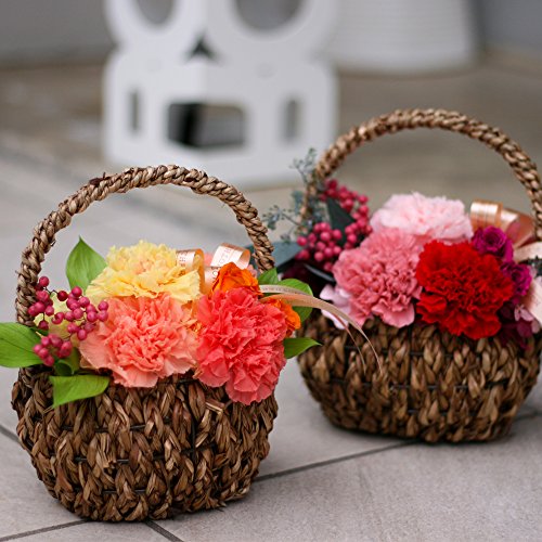 - ・材料 プリザーブドフラワー:カーネーション、ローズ、アジサイ、ペッパーベリー、リーフ(アイビー、ユーカリ)その他:手持ちカゴ ピック リボン