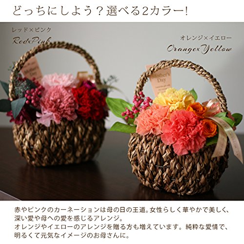 母の日にぴったり♪カーネーションとバラのプリザーブドフラワーをリボンで飾った華やかなバスケットアレンジです。お誕生日プレゼント、結婚・出産祝いなど様々な用途に使えます。 ・お花の色:レッド×ピンク オレンジ×イエロー ・サイズ 高さ約19cm×幅約24cm×奥行約14cm (幅は葉とリボンの長さも含む) ・材料 プリザーブドフラワー:カーネーション、ローズ、アジサイ、ペッパーベリー、リーフ(アイビー、ユーカリ) その他:手持ちカゴ ピック リボン ※注意事項 ・1点1点手作りの為、細かいところは写真と違う部分もあります。 ご理解の上ご注文下さい。