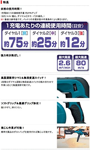 マキタUS BUB182Zと純正バッテリーBL1830のセットです。 ※ブロワー 国内で販売されている マキタUB182D と同等品です。 日本でも問題なく使用できます。 日本国産のバッテリーも問題なく使用出来ます。 ブロワ風量 0~2.6m3/min ブロワ風速(ノズル付) 80m/s 集じん風量 0~2.6m3/min 集じん真空度 0~5.4kpa 集じん量 2L 連続使用時間 強:約12分 中:約25分 弱:約75分 ・強力吹き飛ばし! ・風量調節用ツマミ&無段変速スイッチ! ・ソフトグリップ&最適グリップ形状! ・集じん作業が可能! ※マキタUS 純正バッテリー BL1830 マキタ 18V 純正リチウムイオンバッテリー BL1830 従来の差込み式バッテリに比べ、バッテリ寿命までの総作業量約3.3倍を実現しました。 継ぎ足し充電が可能!! メモリ効果がないため、継ぎ足し充電が可能になりました。 長期保存に強い!! 自己放電が少ないため、長期保存しても満充電に近い作業が可能です。