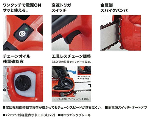 充電式ですので電源ボタンを押すだけで始動し、チェーンオイル残量確認窓や工具レスチェーン調整などの機能が充実し、使いやすさを高めています