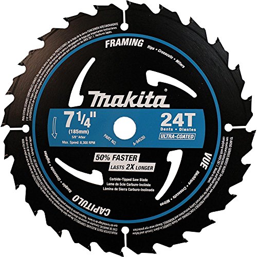 Exclusive dual-beveled tooth face has two 10-Degree angles. The Makita 7-1/4 in. 24T Ultra-Coated Framing Blade is ideal for a full range of wood cutting applications. The ultra-coated blade resists pitch build-up, and the high-grade fine-grain Tungsten Carbide tips are engineered for improved durability and longer blade life. Makita's exclusive "M"-shaped blade tooth has two cutting points, so it delivers the cutting speed of a 24-tooth blade, but with the finish of a 48-tooth blade.
