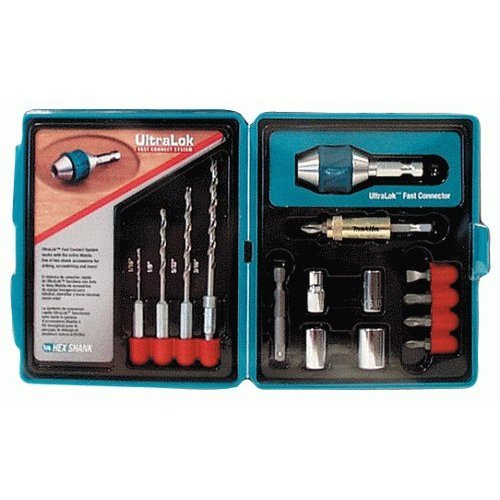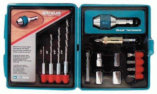 Product Description Makita UltralokTM Set 784874-A# Allows fast and easy drill and driver bit changes.# The UltraLokTM system fits all 3/8' and 1/2' drills.# All 1/4' hex shank bits easily connect and disconnect into the UltraLokTM without any drill bit spinout. From the Manufacturer Makita introduces their new innovative fast connect accessory system. The UltraLoc is a fast connect accessory system that allows users to change drill accessories quickly and easily. The U.S. made UltraLoc has an exclusive double-action spring design for one-handed operation. It also features a connector that fits all Makita or other brand 3/8-inch and 1/2-inch drills. The UltraLoc has a universal connection that fits popular 1/4-inch hex shank thus eliminating drill bit spinout. UltraLoc makes it a simple two-step process for drill bit removal: simply pull and release. It is 100% faster than switching bits with a keyed chuck and it is up to 75% faster than keyless chucks. The UltraLoc system is tough and long lasting due to its industrial, aircraft aluminum construction and high impact sleeve. The ruggedness makes it ideal for contractors, while the practicality makes it convenient for the do-it-yourselfer. Includes UltraLoc, shorty finder/driver, four insert bits, four drill bits, three sockets, adapter, and case.