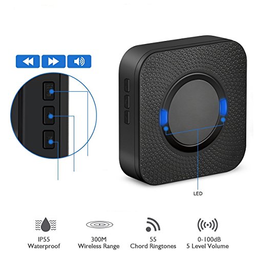 ワイヤレスドアベルは高感度受信機採用で、電波の飛距離は屋外見通し、最大300mの無線範囲をサポートできます。 チャイムは呼び出し音が55種類あって自由に選択可能、音量が0db~100dbまで4段階で調節可能、いろんな環境と要求を満足できます。お好きな音楽をお楽しみにしてください。多種ライトモードも選択できます。IP55防水等級なので、トイレと浴室にも使用でき、超低消費電力設計採用されて、省エネと持続利用することできます。前の曲/次の曲ボタンを押してお好きな音楽を選択したらいいです。送信機は両面接着テープを利用してドア/壁に付着させます。取り付け方でも非常に簡単です。 日本語説明書が付きます。使用中何か不明な点と問題がございましたら、ご気軽にお問い合わせてください。