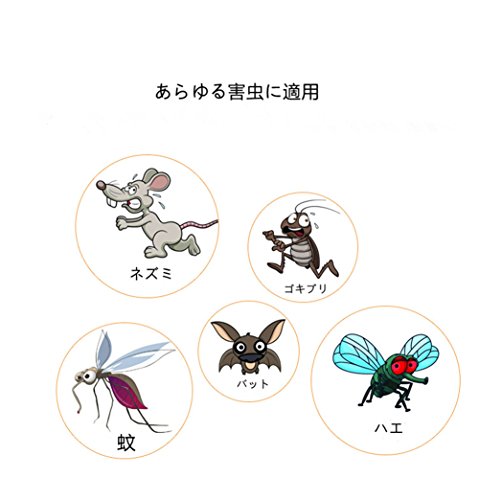 - 有効範囲が広い:100平方メートルの有効範囲、かなり広いなので、この一本でお家が十分です。そして、ネズミ、ゴキブリ、ハエ、蚊、バットなどに適用です。