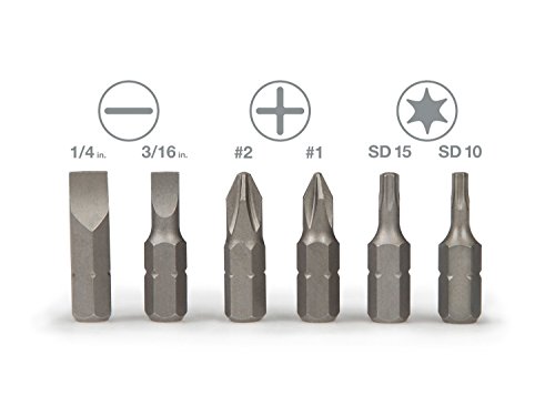 Gearless ratchet design locks at any 360 degrees position for easy driving even in the most limiting work areas. Quick selector for forward and reverse drive. Precision-machined sandblasted chrome vanadium steel bits. Rugged, impact resistant nylon handle construction. Six bits store conveniently in handle. 6-piece 1-inch screwdriver bit sizes: flat: 3/16-inch, 1/4-inch Phillips: #1, #2 star: SD-10, SD-15.