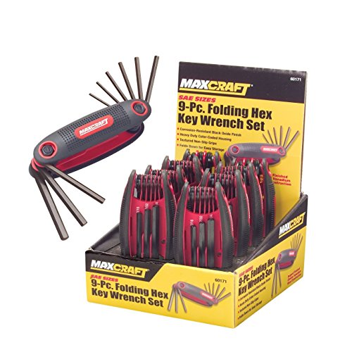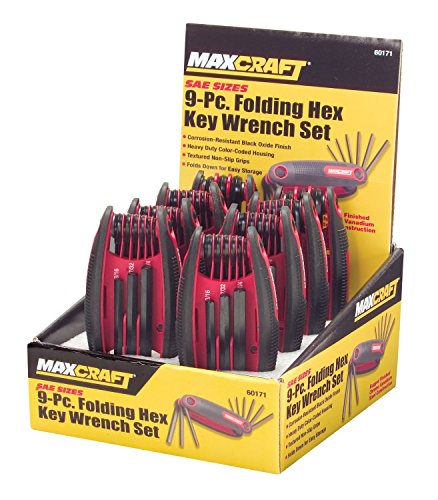 Rugged, black oxide finished chrome vanadium steel wrenches. Heavy duty color-coded housing. Folds down for easy storage. Textured non-slip grips. 9-Piece Hex (SAE): 5/64, 3/32, 7/64, 1/8, 9/64, 5/32, 3/16, 7/32, and 1/4-inch.