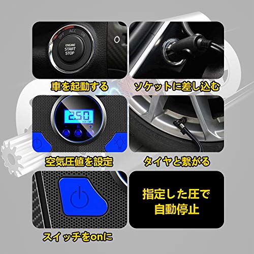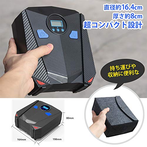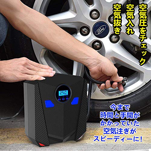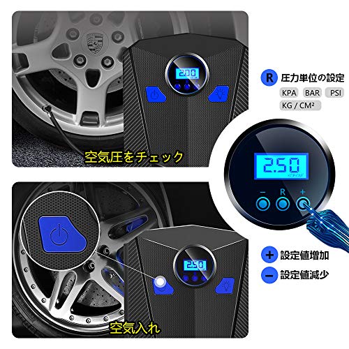 - 【3in1エアコンプレッサー 】:クリアなデジタルディスプレイので、いつでもタイヤ空気圧をチェックし、「R」ボタンで空気圧の単位を切替できます。「+/-」ボタンでタイヤの気圧値の設定も可能で、必需な気圧に達した時に自動的に停止します。 それに、空気入れだけでなく、空気抜き対応!