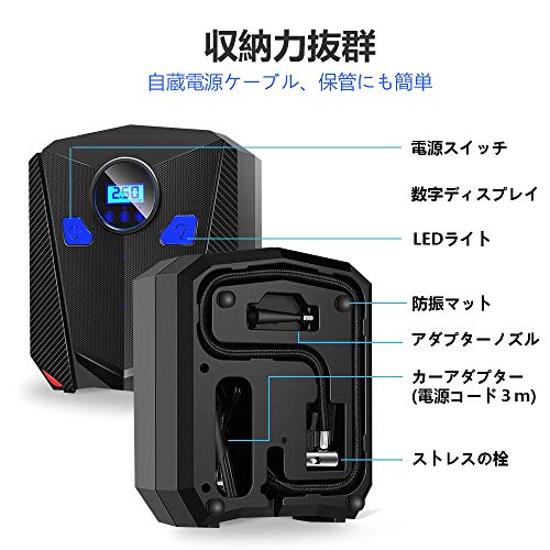 - 【収納に便利】:コンパクトなタイヤ空気入れに設計されて、電源コードとエアホースは後ろの溝に入れやすく保管できます。約3mの電源コードは全ての車のタイヤに伸びます。保存するのも易いです。