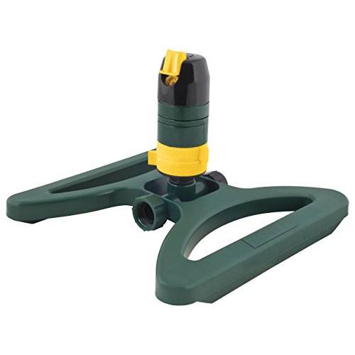 Turbo Drive Rotary Sprinkler waters lawn in two stages for even coverage up to 5,000 feet. It features a turbo drive motor and a sled base for stability and easy placement.