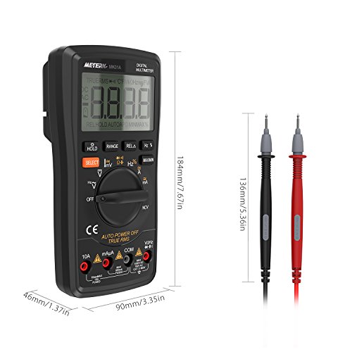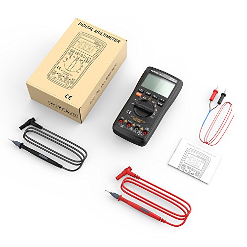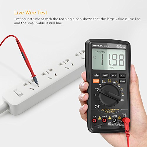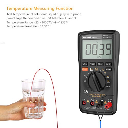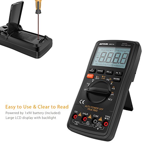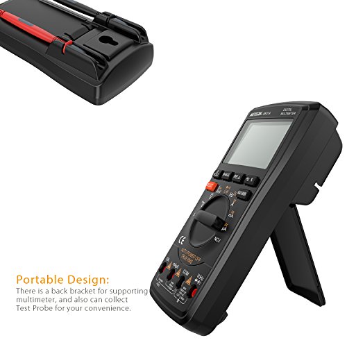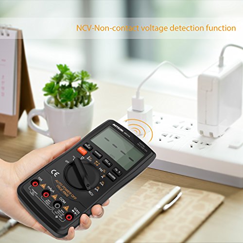 高精度で高性能なこの多機能マルチメータは、DC / AC電圧、AC / DC電流、抵抗、静電容量、周波数、デューティ比を測定することができます。また、NCV(非接触電圧)、温度および、ライブライン、ダイオードおよび連続性もテストできます。背面にブラケットを置いて、テーブルに置いて値を読むのが便利です。
