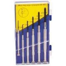 Mint craft JL360013L Precision Screwdriver Set 6 Piece has a chrome finished, metal fluted handle with black finished, corrosion resistant tip and plastic case.