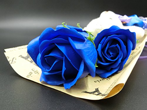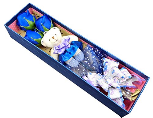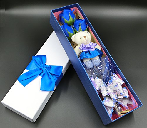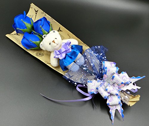 (Miwoluna) ブーケ 花束 ローズ くまのぬいぐるみ付き リボン付きのボックス ほのかな香り付き 各色 (05. ディープブルー)