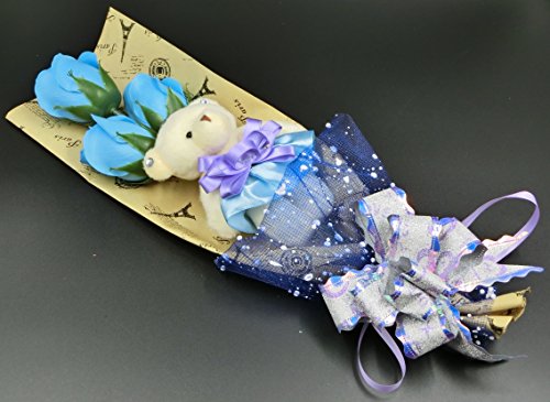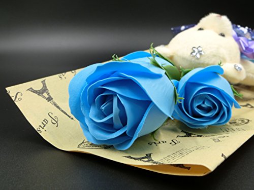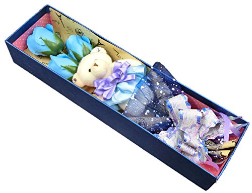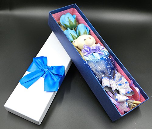 Miwoluna くまのぬいぐるみ付き ローズブーケ リボン付きのボックス ほのかな香り付き 各色あります (07. ライトブルー)