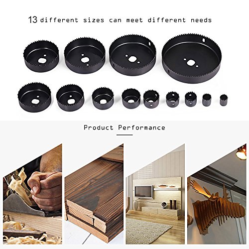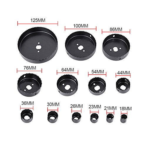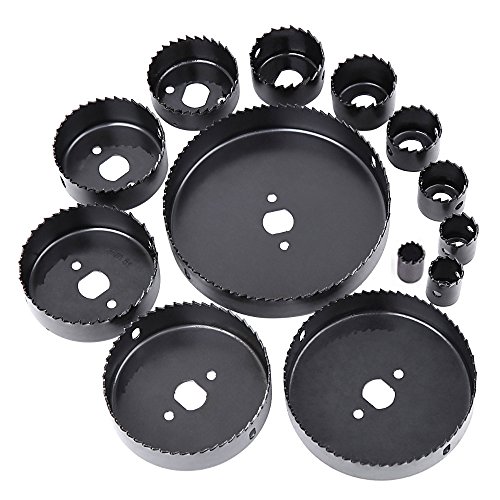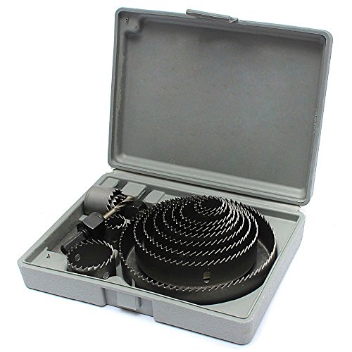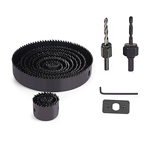 - セットには、13本の高炭素鋼製の穴のこぎり、パイロットドリル付き2本のアーバー、1本の六角レンチ、1本の取り付けプレート