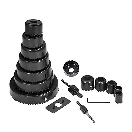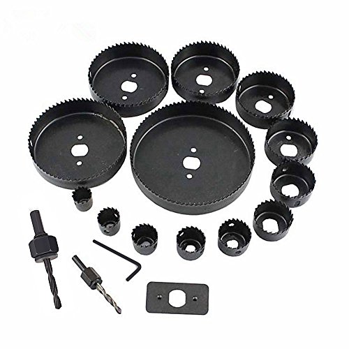セットには、13本の高炭素鋼製の穴のこぎり、パイロットドリル付き2本のアーバー、1本の六角レンチ、1本の取り付けプレート