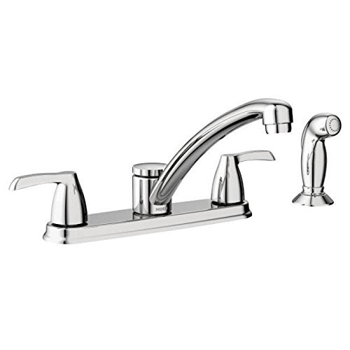 Powerful rinse for heavy-duty cleaning. Chrome finish is highly reflective for a mirror–like look that works with any decorating style. Features Duralock quick connect system for easy installation. Two-handle lever and knob handles. Included side spray for convenient cleaning at the sink. Powerful rinse for heavy-duty cleaning. Standard design mounts on the sink or counter top. Plug included for optional side spray use, three or four hole installation.