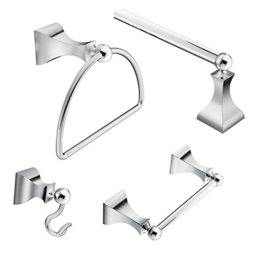 - Kit includes single robe hook, toilet paper holder, 24-in towel bar, towel ring