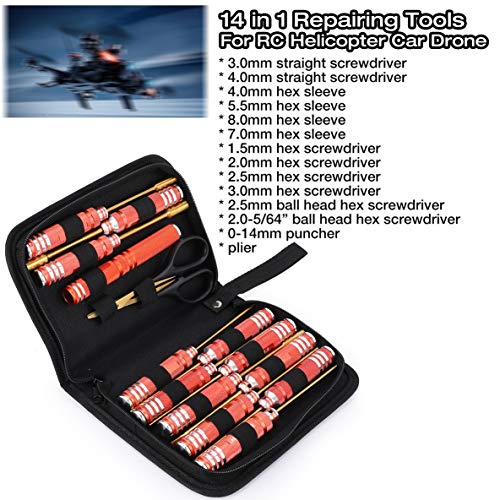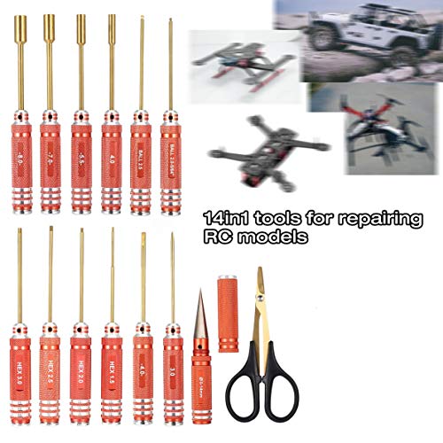 1 This package includes 14pcs different tools, hex/straight screwdriver, hex sleeve, pliers, puncher, suitable for most rc models.