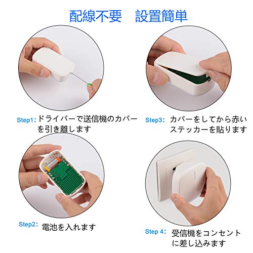 - 【使用簡単&省エネ設計】無線で配線工事が不要です。電池式なのでどこでも設置できます。受信機はコンセントに差し込み、発信機は付属の両面テープ或いはねじでお好きな場所に固定できます。このチャイムは超低消費電力設計を採用しとり、省エネと持続利用に優れています。