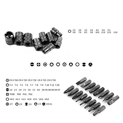 - 【仕様】セット内容:グリップ、延長バー(エクステンションバー)、ビット70種類 箱のサイズ:長さ20×高さ4.5×幅13.5cm グリップ部分のサイズ:長さ10cm×直径2cm 延長バー:10cm 素材(金属部分):CRV(クロムバナジウム鋼)
