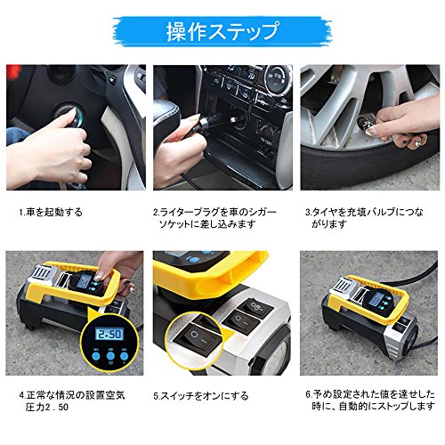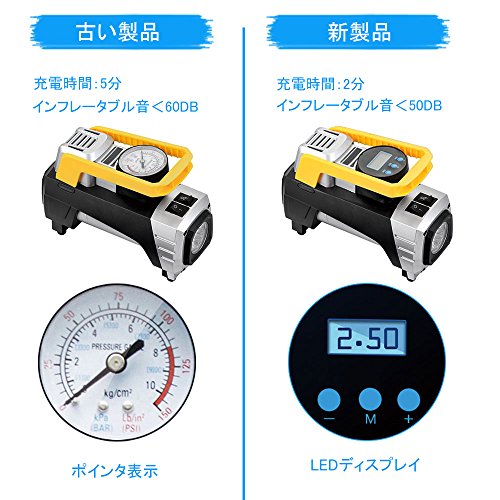 - 【オートストップ機能】設定した空気圧を達すると自動停止できる。差し込むだけで空気入れでき、安全運転を確保。作業音は<50DB。