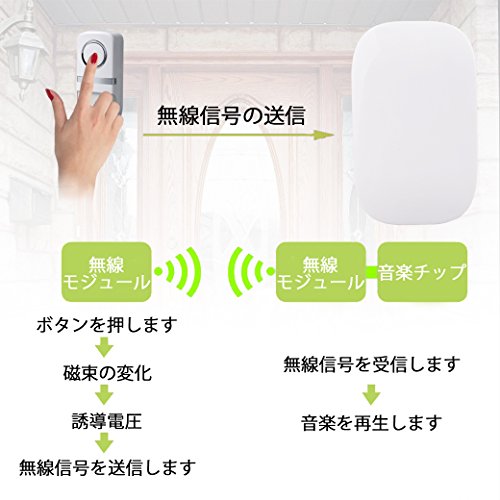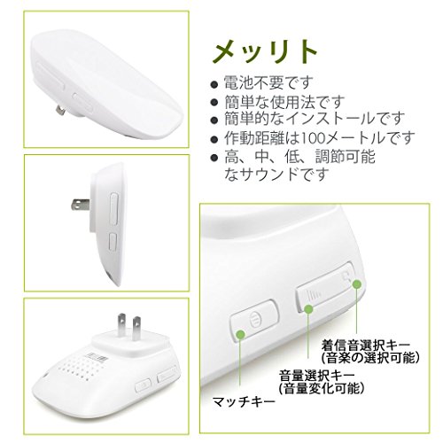 - 親機はコンセントに直接差し込むタイプ、子機は電池いらずワイヤレスチャイム