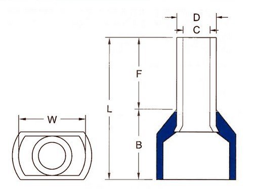 Funneled Entry for Ease of Wire Insertion. Dual Wire Entry Design facilitates termination of 2 Conductors to a single point according to DIN Standards. Available in Multiple Pin Lengths to accomodate a variety of Terminal Blocks Styles. 221°F (105°C). 600 Volts Max. Max Current: 22 AWG - 9 Amp, 20 AWG - 12 Amp, 18 AWG - 17 Amp, 16 AWG - 18 Amp, 14 AWG - 30 Amp, 12 AWG - 35 Amp, 10 AWG - 50 Amp. UL Recognized.