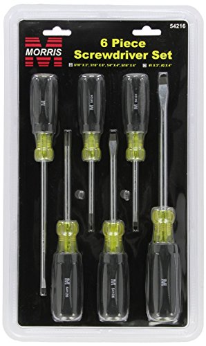 The Morris Products 54216 Screwdriver Set includes six screwdrivers for tightening and loosening screws. The set includes four slotted tip and two Phillips tip screwdrivers to accommodate the two most common screw drive styles. The drivers are made of steel for wear resistance. Assortment Includes 4 slotted screwdrivers3/16', 3' length3/16', 6' length1/4', 4' length5/16', 6' length2 Phillips screwdrivers#1, 3' length#2, 4' lengthMorris Products manufactures electrical and lighting products such as meters and testers, tools, power connectors, and organizational devices. The company, founded in 1994, is headquartered in Queensboro, NY.What's in the Box?4 slotted screwdrivers3/16', 3' length3/16', 6' length1/4', 4' length5/16', 6' length2 Phillips screwdrivers#1, 3' length#2, 4' length