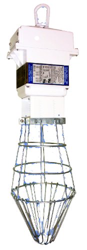 Hanging 400W halide work light for use in temporary job site lighting;Quad-tap ballast for use with 120, 208, 240, or 277 volt power supply;Pulse start ballast for reduced lighting time and increased energy efficiency;Powder-coated steel wire protective bulb cage for work safety and outdoor use;Meets UL 1598 standard for use in damp locations