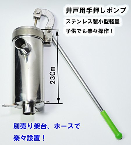- 小型軽量の井戸用手押しポンプです。ステンレス製。 庭や畑の水やりに、災害時の非常用に子供の水遊び用に。 小さいバケツならすぐにいっぱいになります。 最近はあまり見かけなくなりましたが昔日本にあった 手押しの井戸水ポンプと構造は同じです。 条件にもよりますが、水量も大人がポンピングした場合、家庭用の水道を全開にしたくらいはありそうです。 井戸があるととても便利です。 小さい子供(4歳くらい)でもポンピングできます。 本品は海外製品となっています。使用するうえでは全く問題 ないと思いますが、細かいところの仕上がり等は写真で判断 願います。