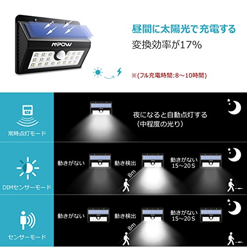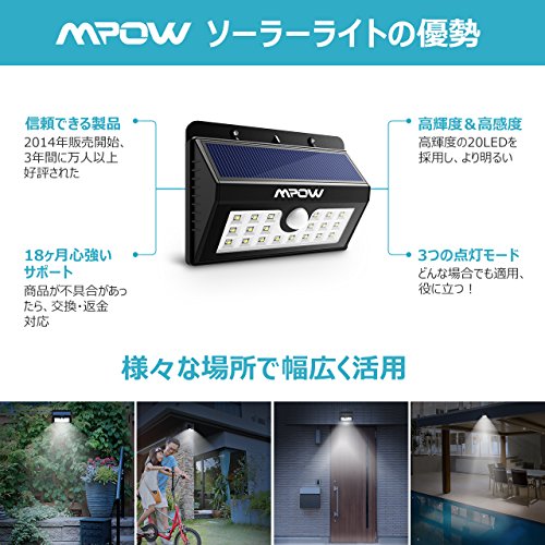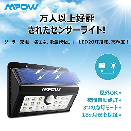 Mpow 20 LED ソーラーライト センサーライト 外灯 玄関ライト 人感センサー 夜間自動点灯 電気代ゼロ 屋外照明/軒先/壁掛け/庭先/玄関周りなどのライト 夜間自動点灯 防犯用