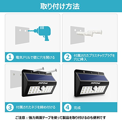 - 【★利便性&安心保証★】取り付け方法は簡単です。ワイヤレスで配線が一切不要です。 壁や柱など、照明が必要な場所に付属のネジなどを利用して取り付けます。より良い照明効果を得るために、できるだけ長時間に直射日光が当たるの場所を選んでください。取り付け高さは2mです。Mpowブランドは3年間のプロ好評実績を持ち、信頼できます。すべてのMpow製品はご購入日から45日間の返金&18ケ月の安心保証が付きます。