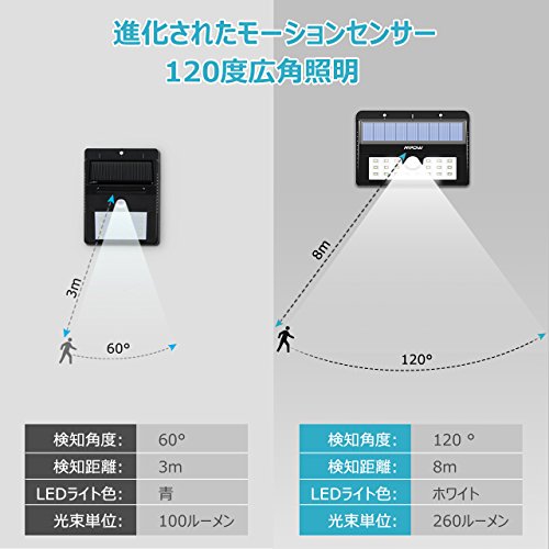 - 【★広角照明&120°高感度★】高輝度20LEDライトを備え、照明角度が最大270°に達します。また、最新のセンサーボールヘッド(円型)を採用しますので、検知距離と検知範囲も大幅に広くなります。最大検知距離が8mになり、最大検知角度が120°になります。照明と防犯効果が十分です。夜間に素敵な照明効果を提供してくれ、防犯効果に設置してぴったりです。夜帰ってくる度に玄関を照らして、鍵穴まではっきり見えます。