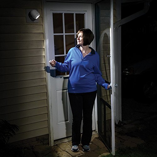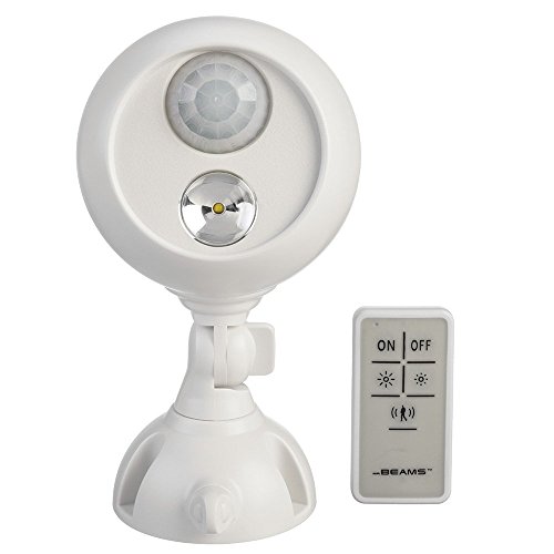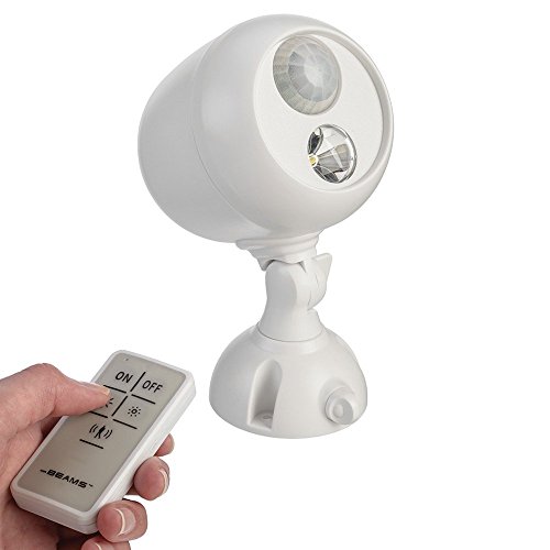 - Remote control LED spotlight with two auto shut off options (one hour or four hours)|Three brightness levels (60, 90, 140 lumens)|100% Wireless LED battery operated spotlight. Requires 3 D-Cell Batteries (not included)|This LED light can be motion sensor activated or remote control activated|Weatherproof spotlight provides 350 square feet of white LED light. Indoor and Outdoor use