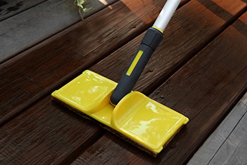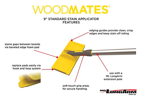 Woodmates, 9", Deck Stain Applicator, Stains 1 Deck Board Width With Overlapping Of Stain For A Smooth, Blended Finish, Beveled Pad To Stain Gaps Between Boards, Pivoting Handle For Access To Hard To Reach Areas, Flextech Tear Resistant Foam Pad Holds & Releases More Stain, Prevents Dripping & Pooling, Hook & Loop Pad Attachment Method For Faster Clean Up & Easy Pad Replacement.