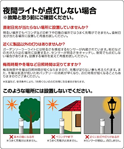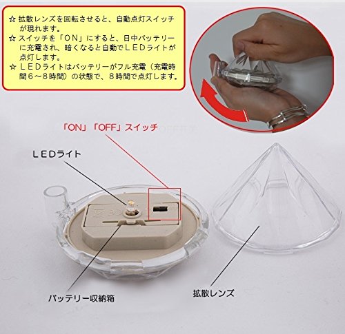 - レンズ内の自動点灯スイッチを入れておくと、昼間に充電され、暗くなると自動で点灯します。(照度センサー内蔵)
