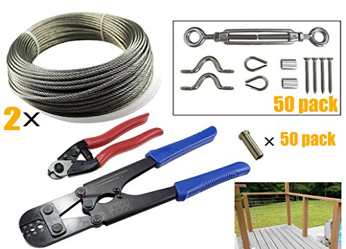muzata50パックHeavy Dutyステンレススチールケーブル手すりキットwith 164フィートの2ワイヤロープケーブル、ケーブルカッター、手Crimperツールと50パックプロテクタースリーブfor 1 /8 "ケーブル手すり、フルセット