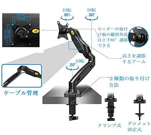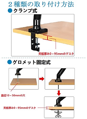 - デスクへの設置は、クランプ式とグロメット式の2通りに対応しています。モニターからのケーブルをすっきり配線できるケーブルクリップ付きです。取り付け方の説明書の日本語版も部品も用意しております、取付がとても簡単です。