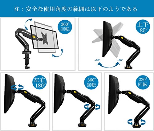 - モニターアームを使うことで、パソコンの台座を必要としない分広々とデスク上を使用できます。画面の向きを上下に85度、左右に180度調節が可能です。360度回転させることもできます。