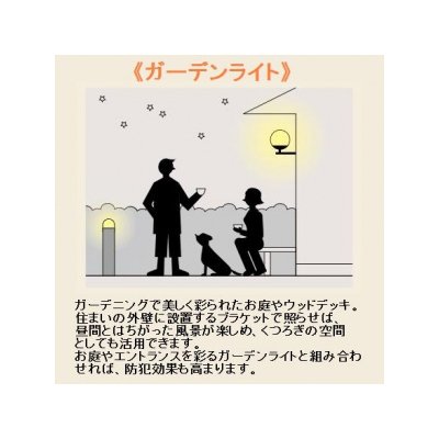 ●ガーデニングで美しく彩られたお庭やウッドデッキ。住まいの外壁に設置するブラケットで照らせば、昼間とは違った風景が楽しめ、くつろぎの空間として活用できます。また、お庭やエントランスを彩るガーデンライトと組み合わせれば、防犯効果も高まります。 - 【仕様】