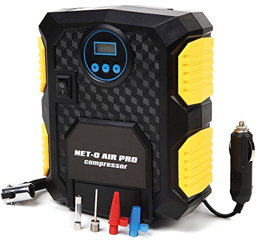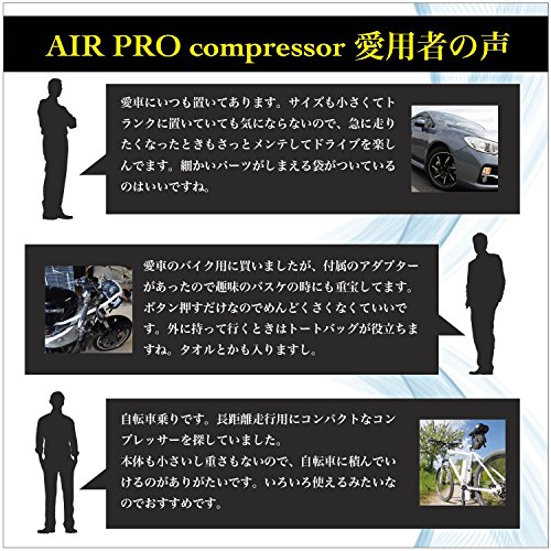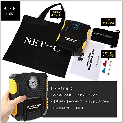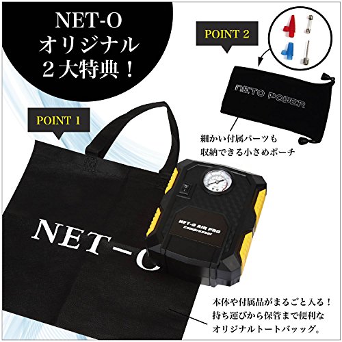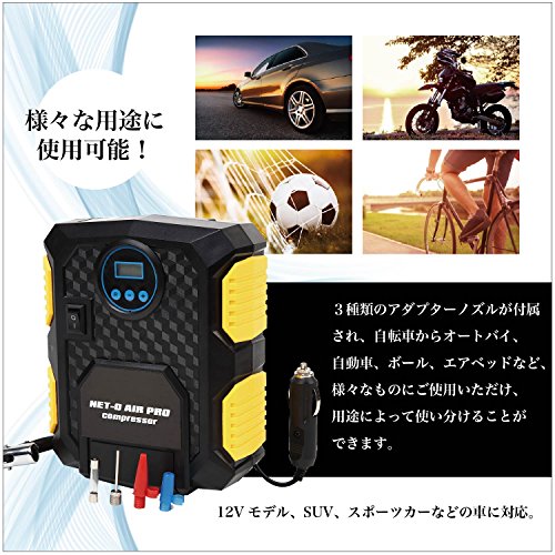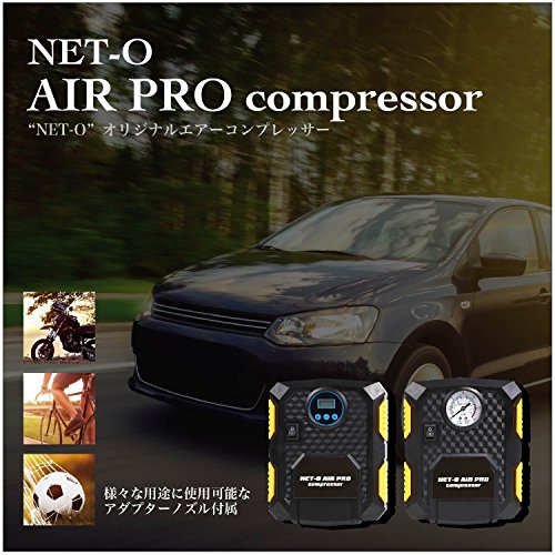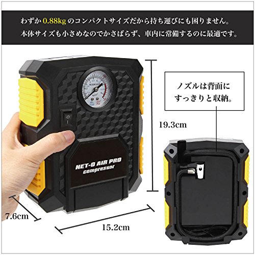 NET-O 車用空気入れ AIR PRO COMPRESSOR エアーコンプレッサー ハイプレッシャーポンプ 電動ポンプ コンパクト シガーソケット接続式 3種類アダプターノズル付き LEDライト付き 自動車 バイク 低音 PSE認証 (シリンダー22)
