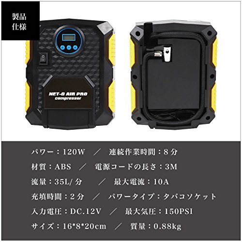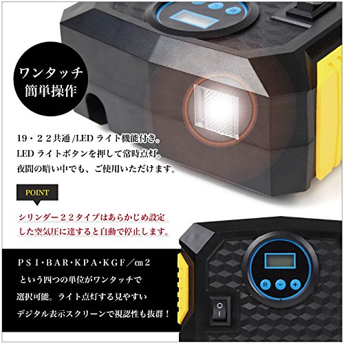 シリンダー19タイプ:自動で止まる機能がありません。メモリを見ながら手動で止める必要があります。タイプ22より若干空気を入れるのに時間がかかります。(2〜4分差程度) シリンダー19タイプ:PSI・BAR・KPA・KGF/㎝2 という四つの単位が選べます。大きなアナログ表示で見やすさ抜群!LEDライト機能付き。LEDライトボタンを押して常時点灯。夜間の暗い中でも、ご使用いただけます。 シリンダー22タイプ:設定した空気圧に達すると自動で止まります。 シリンダー22タイプ:ワンタッチスイッチ:スタートを押すと作業を開始し、閉じるを押すと停止します。 (M)ボタンを押してPSI・BAR・KPA・KGF/㎝2 という四つの単位が選べます。バックライト付きのスクリーンとデジタル表示で視認性抜群! 19・22共通/LEDライト機能付き。LEDライトボタンを押して常時点灯。夜間の暗い中でも、ご使用いただけます。 シガーソケットのタイプ、直接挿入することができます。約3Mの電源コード長さは前後のタイヤに気軽に空気補充します。 車の対応:12Vモデル、SUV、スポーツカーなどの車に対応します。 製品の仕様: パワー:120W 材質:ABS 電源コードの長さ:3M 流量:35L/分 最大電流:10A 充填時間:2分 パワータイプ:シガーソケット 入力電圧:DC.12V 最大気圧:150PSI サイズ:16*8*20cm 質量:0.88kg 連続作業時間:8分 セット内容: 1x エアコンプ 1x 日本語説明書 1x 持ち運び用NET-Oバッグ *2018年よりリニューアルで自転車タイヤ用のコネクターが付属になりました。使用の用途が広がり一台あると便利さが増します。