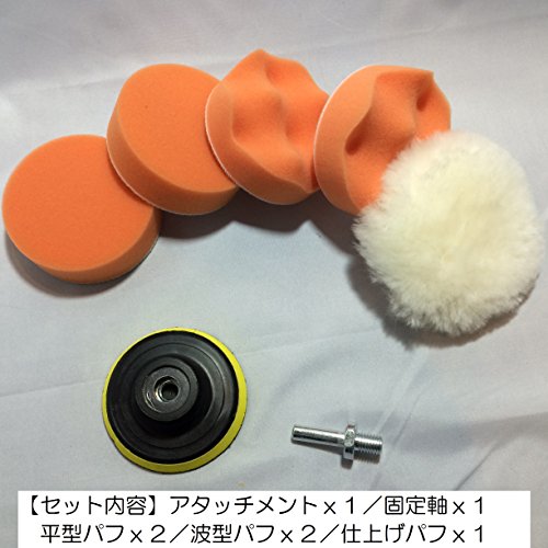 電動ドリル 先端 ポリッシング 7点セット マジックテープ式で脱着する便利なポリッシングセットです 電動ドリルやグラインダーに取り付け、車やご家庭で汚れ落としやつや出しなどの研磨にご使用いただけます [セット内容] 取付アタッチメント × 1個 波形スポンジ × 2個 平型スポンジ × 2個 仕上げパフ × 1個 ネジ × 1個 サイズ 外径80mm(スポンジ厚み25-30mm), 電動ドリル取り付け軸径8mm(長さ26mm)