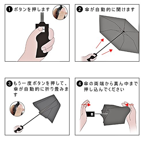 - ☂【自動開閉でカンタン操作】☂➀開くとき:ハンドル部に付いているボタンを押すと開きます。決して人に向けて行わないで下さい。②閉じるとき:再度ボタンを押すと閉じます。③収納するとき:閉じた後傘の先端を押さえ、カチッと音がするまで手元を押し込むと元の状態に戻ります。必ず両手で持ち、傘が地面と水平になるようにして操作を行ってください。壁や物等に押し当てて行わないようにして下さい。