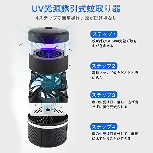 - 【蚊の好む光と二酸化炭素で捕獲】蚊を誘引するのに最適な波長365nmの近紫外線LEDの光と二酸化炭素を放出し、近寄ってきた蚊を吸引ファンで本体のカゴに吸い込み、風化死滅させます。