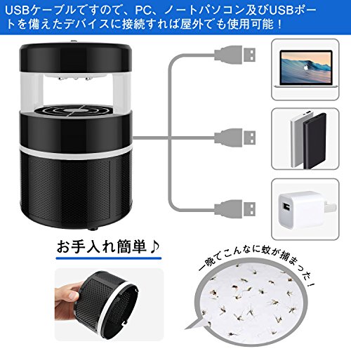 - 【USB給電式&携帯便利】USBタイプですので、PC、ノートパソコン及びUSBポートを備えたデバイスに接続すれば屋外でも使用可能!アウトドア、キャンプ、花火と大活躍!虫が入ったかごは、簡単に取り外して水で洗えます。