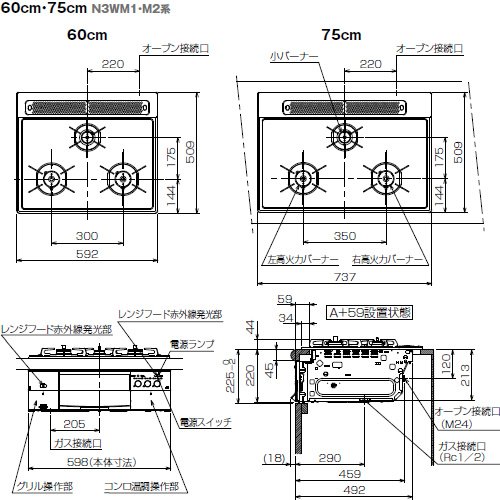ノーリツ ビルトインコンロ 【N3WM1PWAVQSTED】 スタイリッシュブリンク duo 幅:60cm ガス種:12A・13A(都市ガス)
