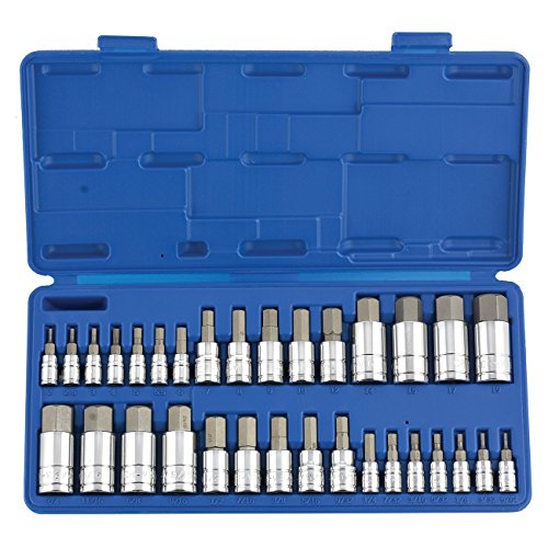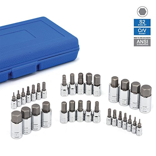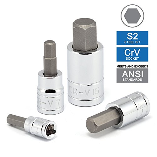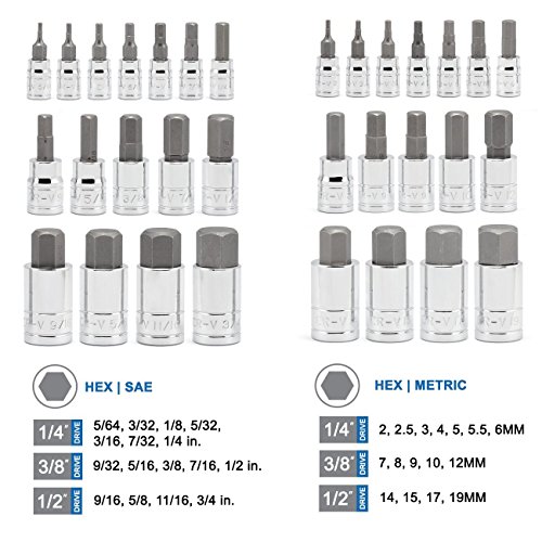 - 16ピースメトリック16進ビットソケット:1/4 "ドライブ:2mm、2.5mm、3mm、4mm、5mm、5.5mm、6mm; 3/8 "ドライブ:7mm、8mm、9mm、10mm、12mm; 1/2 "ドライブ:14mm、15mm、17mm、19mm