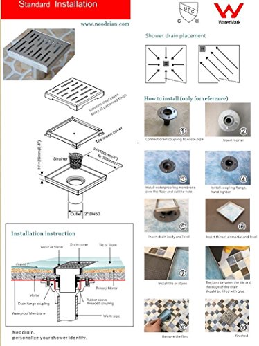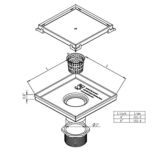 neodrain zs3t01正方形シャワーDrain withタイル挿入Grate、4インチ、つや消し304ステンレススチール 6インチ ZS3-6-ST01